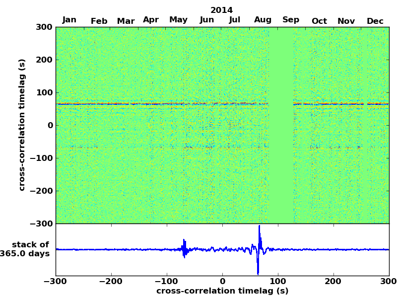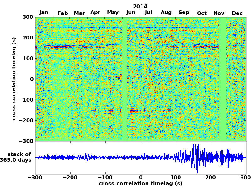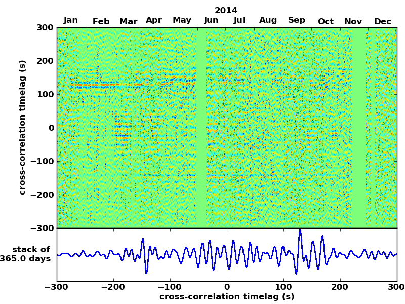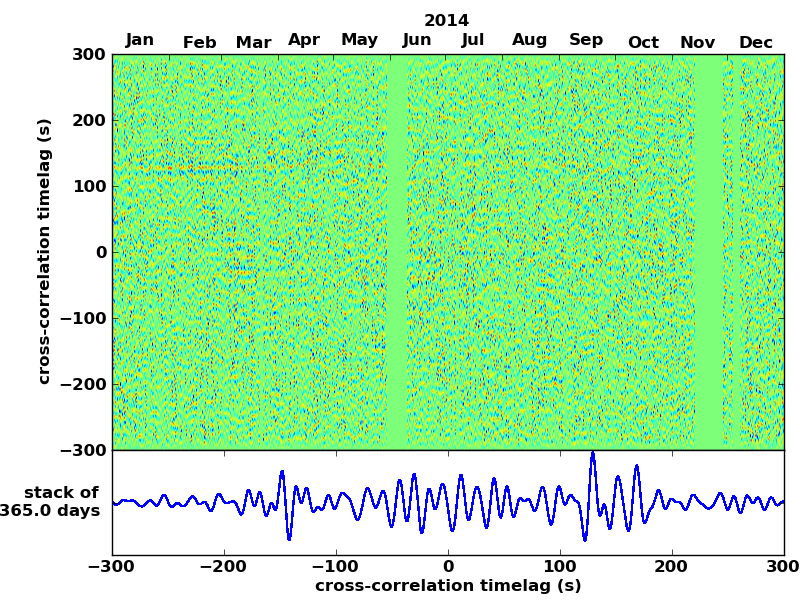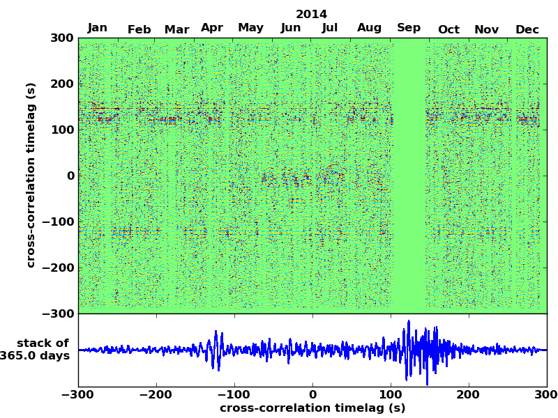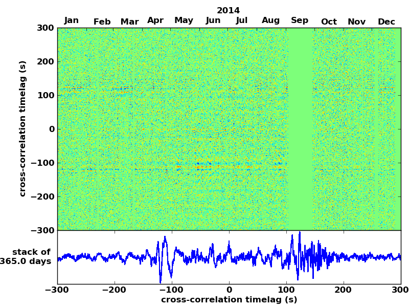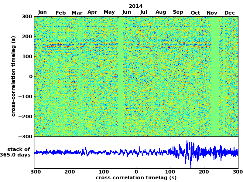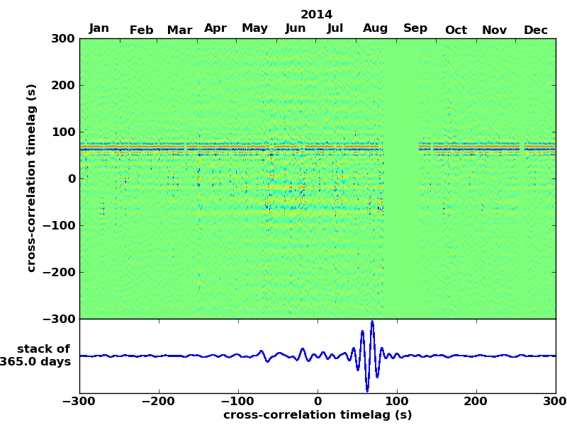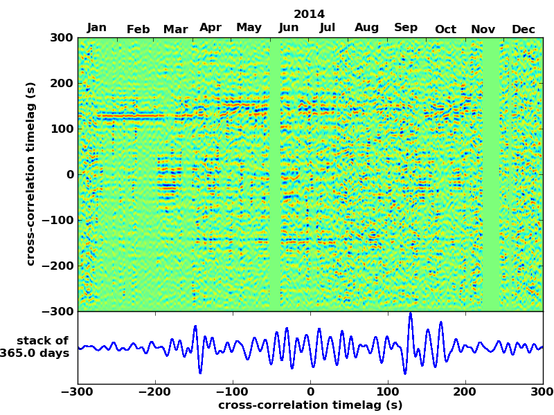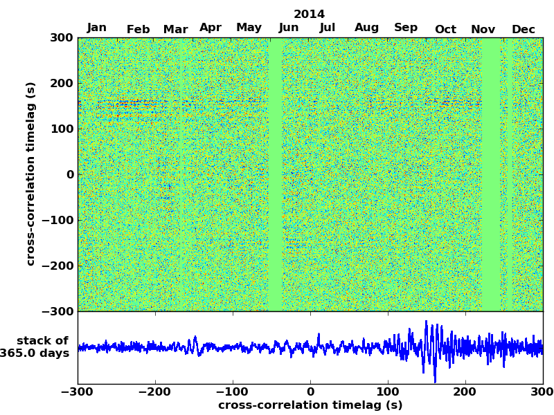 Station pair – HTL-ELSH, 0.02-1,00 Hz. No variation can be observed, but band-passing the signal could reveal existing changes.