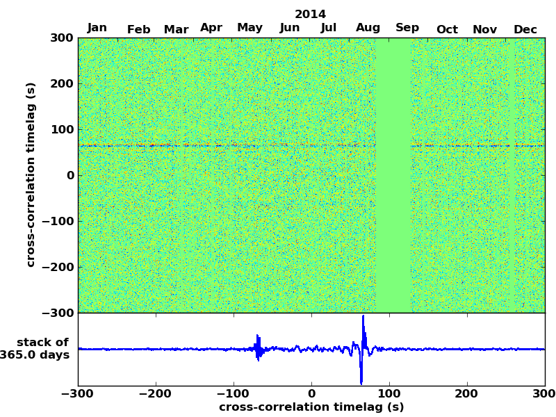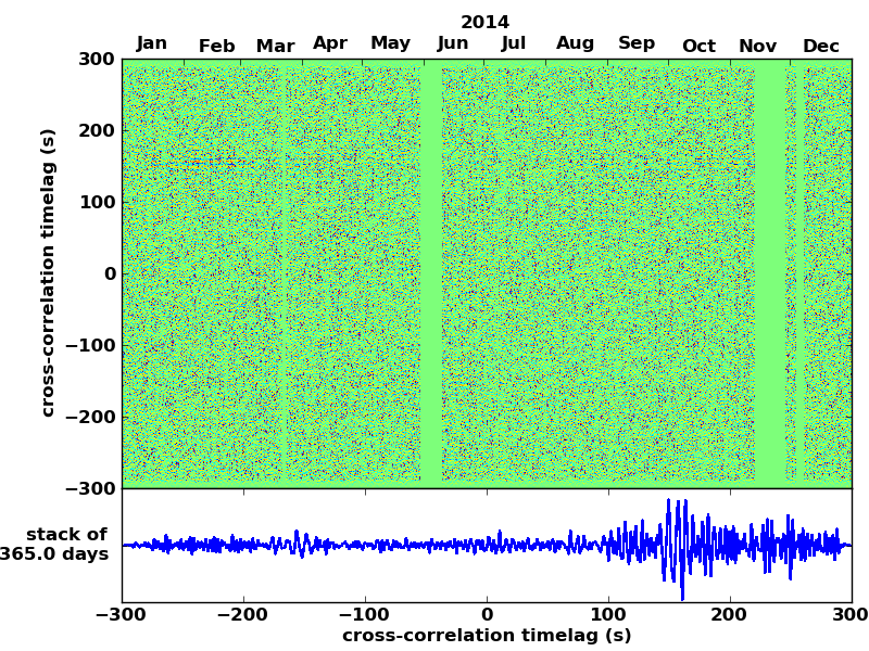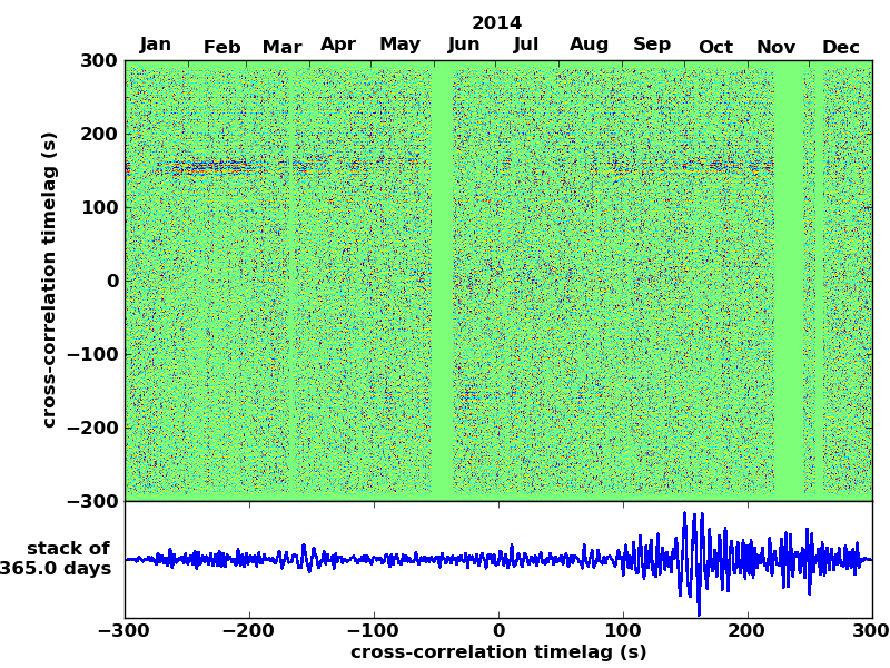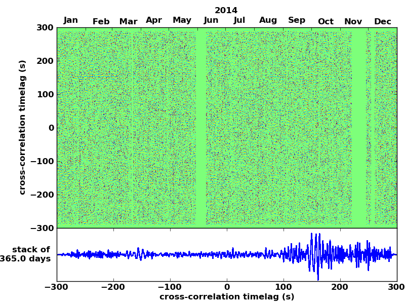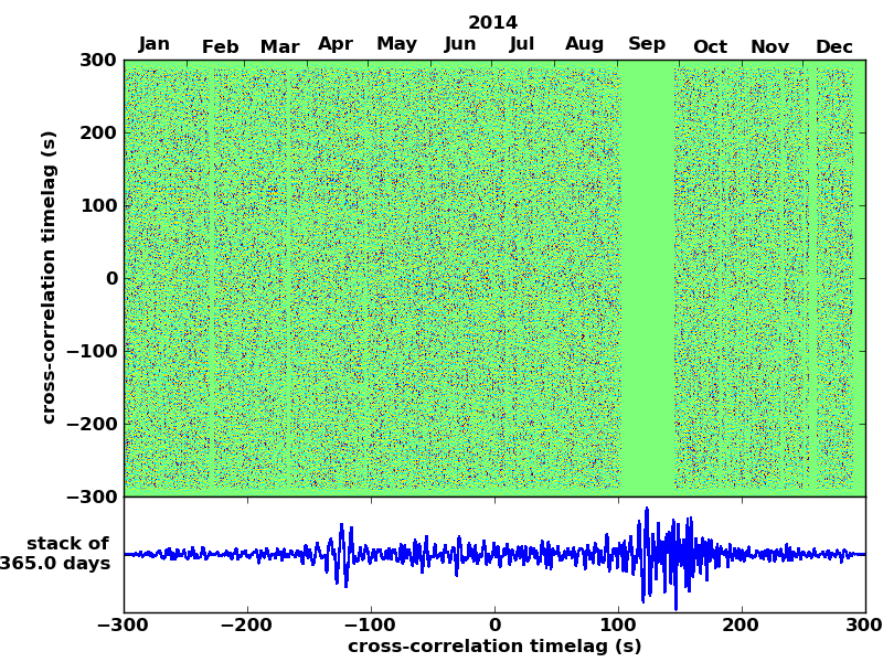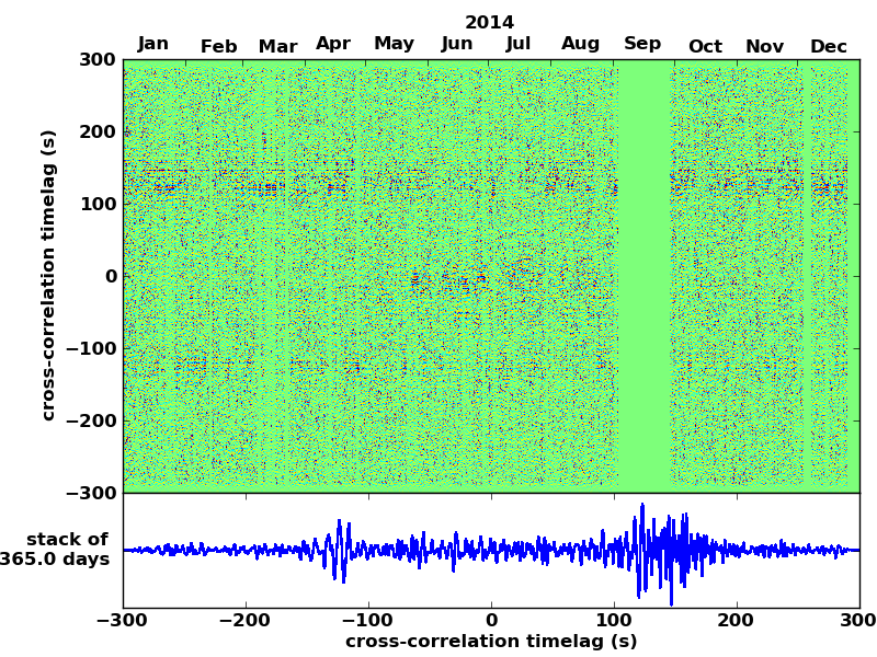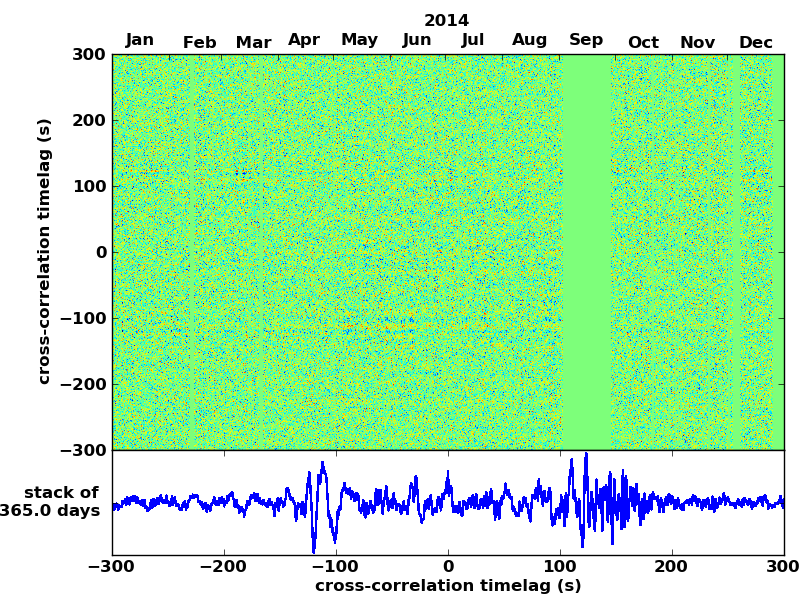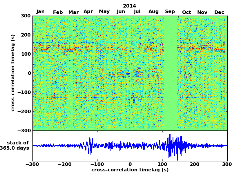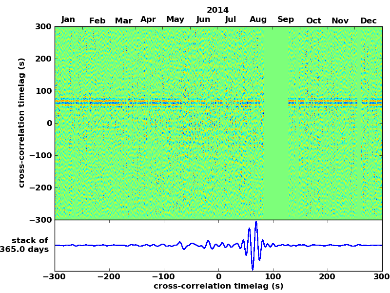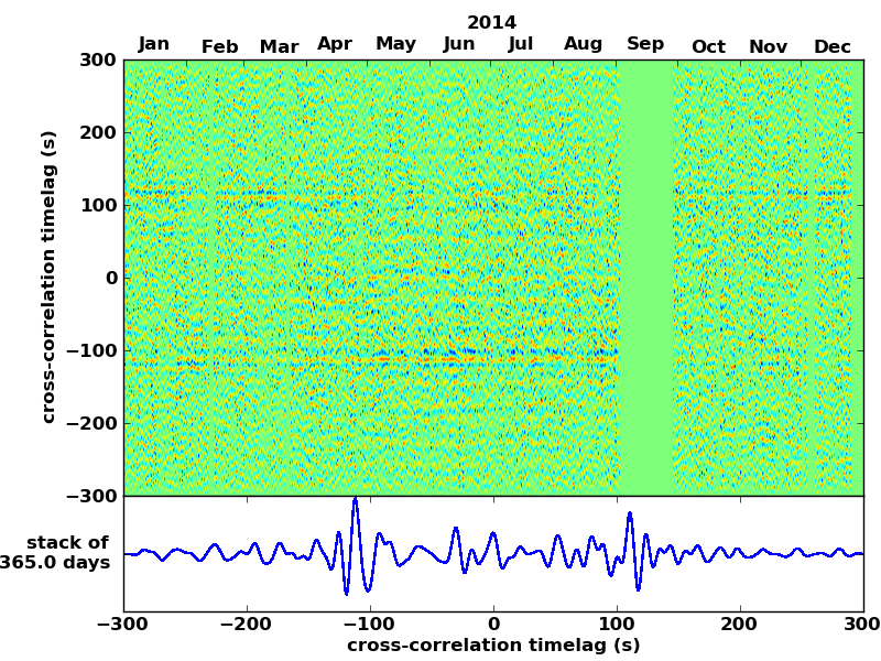 Station pair – HTL-ELSH, 0.02-1,00 Hz. No variation can be observed, but band-passing the signal could reveal existing changes.