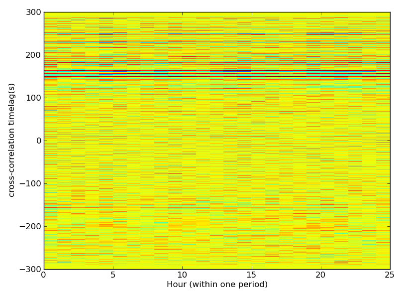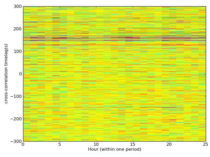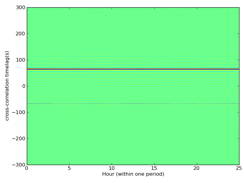 Station pair – KPL-DRUM, 0.02-0.11 Hz. Zoomed into the anticausal part of the cross-correlations, but there is no visible variation in the signal.